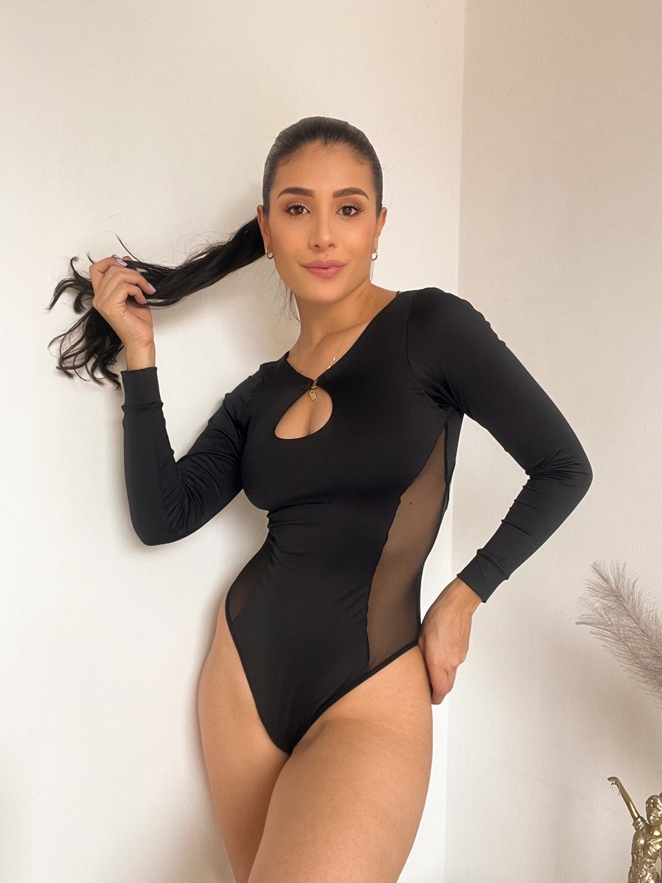 Este body de manga larga en tono negro es la mezcla perfecta entre sensualidad y elegancia. Con aberturas laterales en malla y un sutil escote frontal, estiliza tu silueta sin perder sofisticación. Ideal para usar de día o de noche, te hará sentir segura y poderosa en cualquier ocasión.